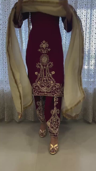 Designer Contrast: The pairing of the deep, rich Maroon with the soft, luminous Cream Organza dupatta is a modern yet timeless choice that ensures all eyes are on you.